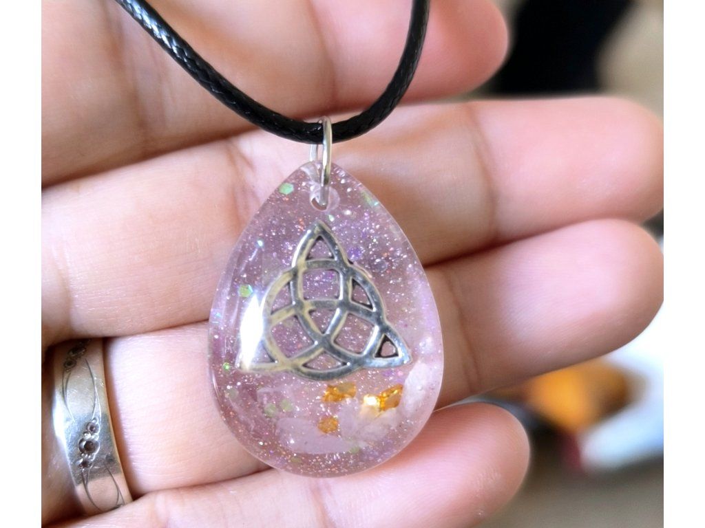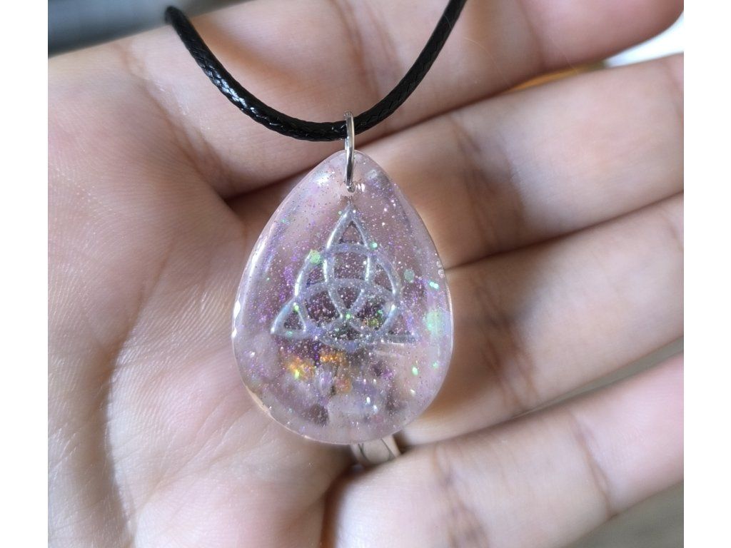 Uvnitř se třpytí drobné třpytky a zlaté kamínky, které dodávají přívěsku magický nádech a hloubku. Růženín, kámen lásky a harmonie, do něj vnáší klidnou, hřejivou energii.