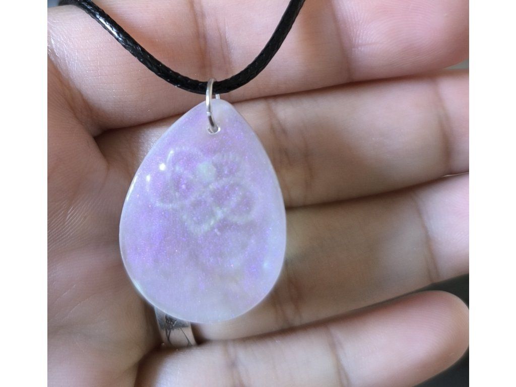 Uvnitř přívěsku se třpytí jemné třpytky v odlišném barevném tónu a drobné zlaté kamínky, které mu dodávají hloubku a lehce magický nádech. Růženín, kámen lásky a klidu, podporuje vnitřní rovnováhu a něžnou energii.