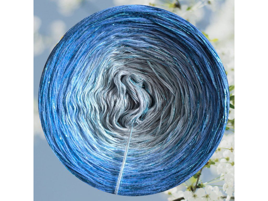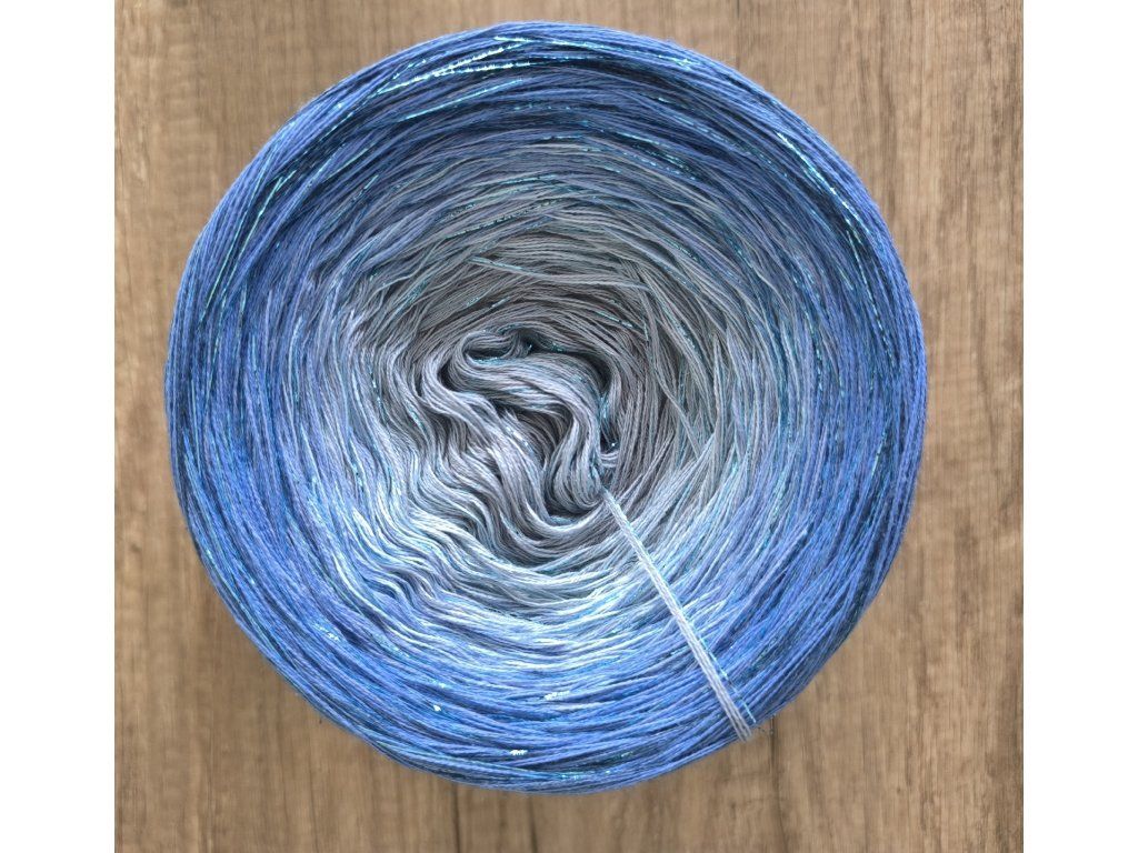 Složení 50% bavlna/ 50% akryl, 3 nitka, klubíčko se skládá z celkem 6 barev + modrý lurex