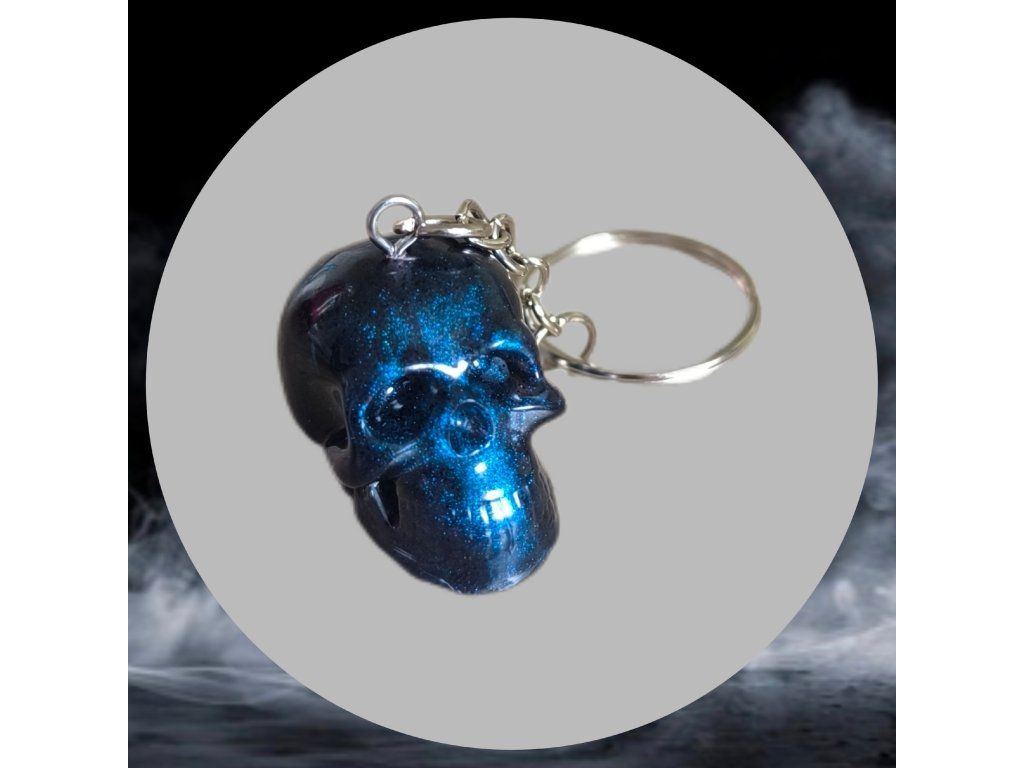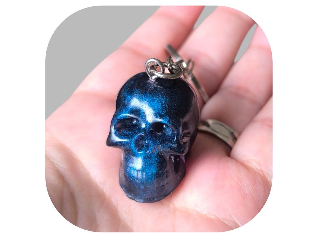 Barevná lebka z epoxidové pryskyřice v modrých odstínech.
