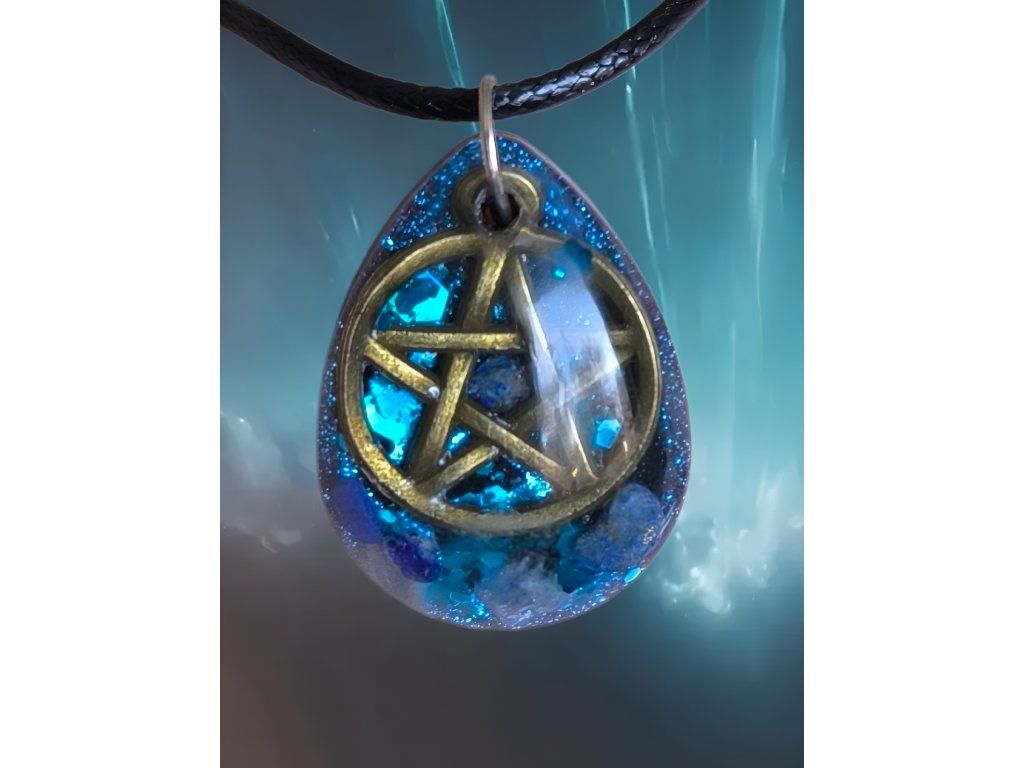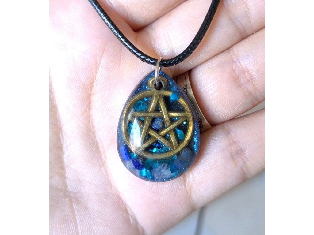 Vstup do světa magie s tímto ručně vyráběným amuletem zdobeným lapisem lazuli, který připomíná noční hvězdné nebe. Pentagram uprostřed symbolizuje ochranu a harmonii.