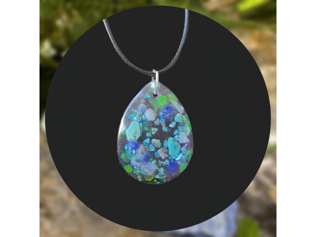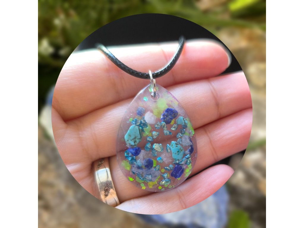 • Přívěsek s lapisem lazuli, tyrkysem a křišťálem – spojení moudrosti, ochrany a čisté energie. Elegantní kapka ve tvaru drahokamu v barvách nebe a země, která podpoří harmonii a klid.