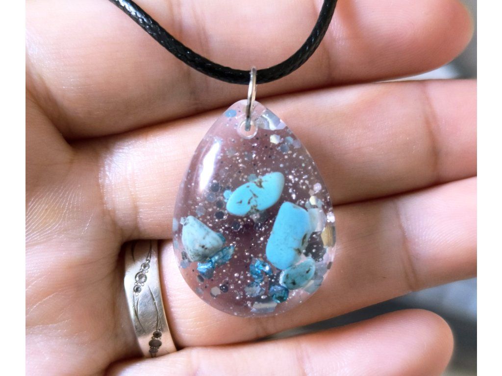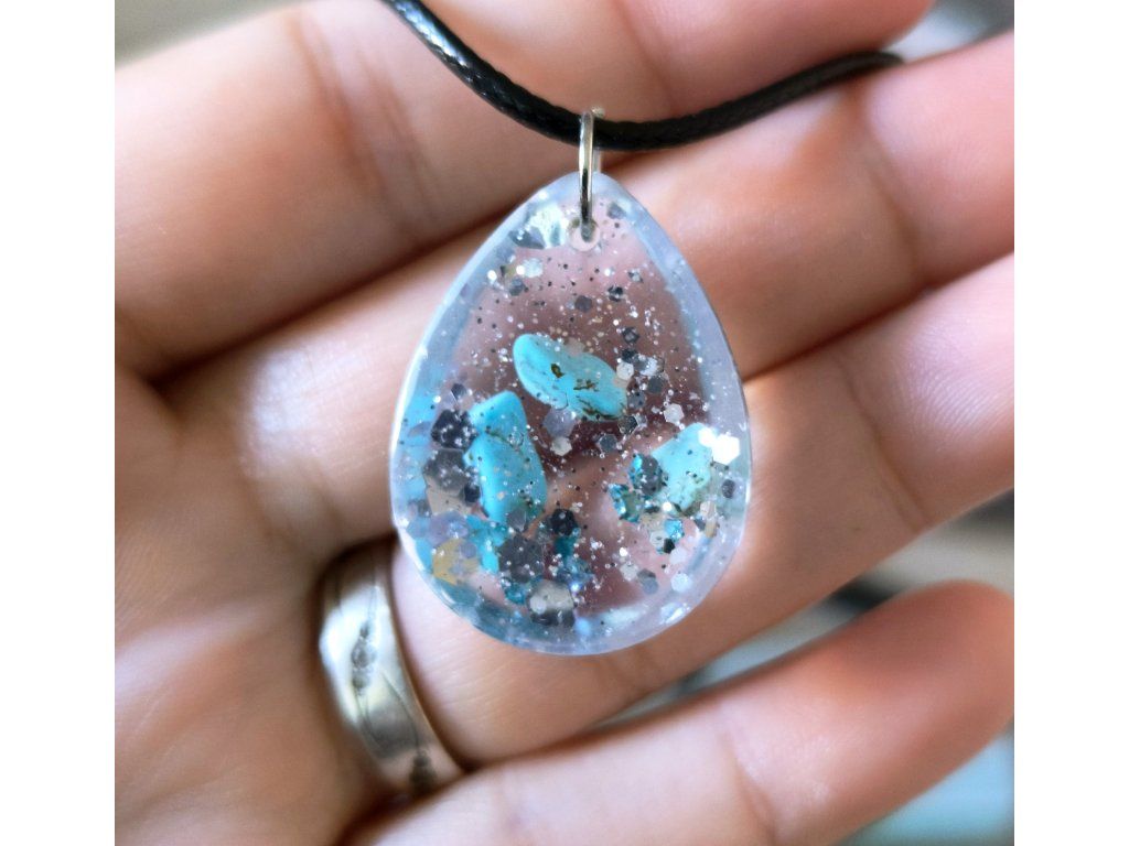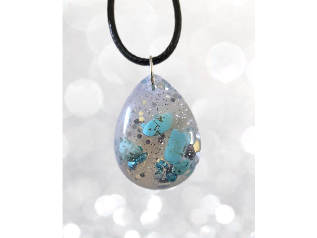 Čistý přívěsek bez symbolů, ve kterém vyniká tyrkys – kámen ochrany, klidu a vnitřní rovnováhy.Jemné třpytky dodávají šperku hloubku a lehce snový efekt, aniž by narušily přirozenou krásu kamene.
